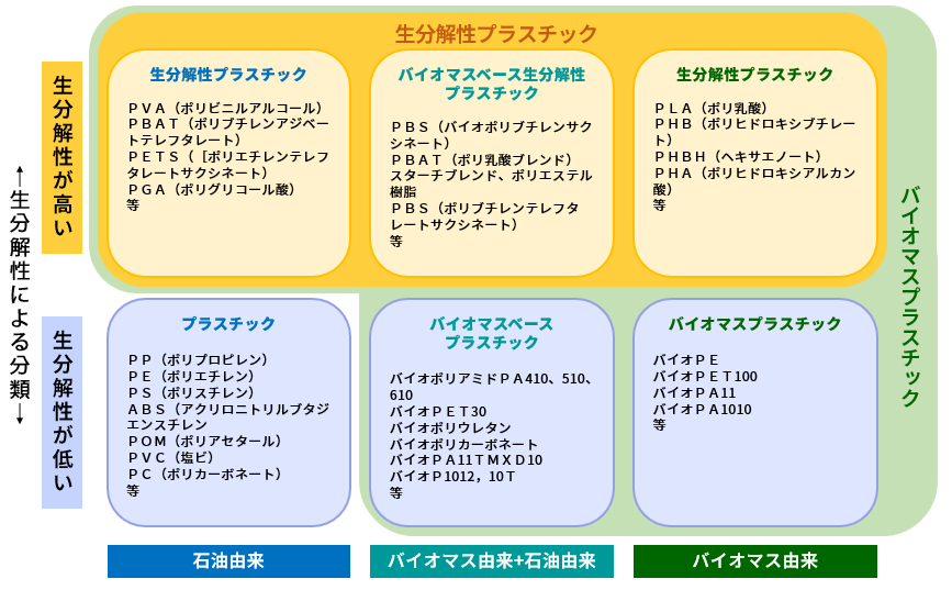 1、生分解性プラスチック・・・原料がバイオマス由来で生分解性を伴うプラスチック